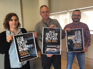 El regidor de Sanitat, Carlos Sánchez, el tècnic de l’àrea de Comunicació, Jorge Villar, i la veterinària, Nuria Chilar, han presentat la campanya “Elxlovescats” amb la qual des de l’Ajuntament es pretén sensibilitzar la població sobre l’important paper que juguen aquests felins en qüestions com el control de rates